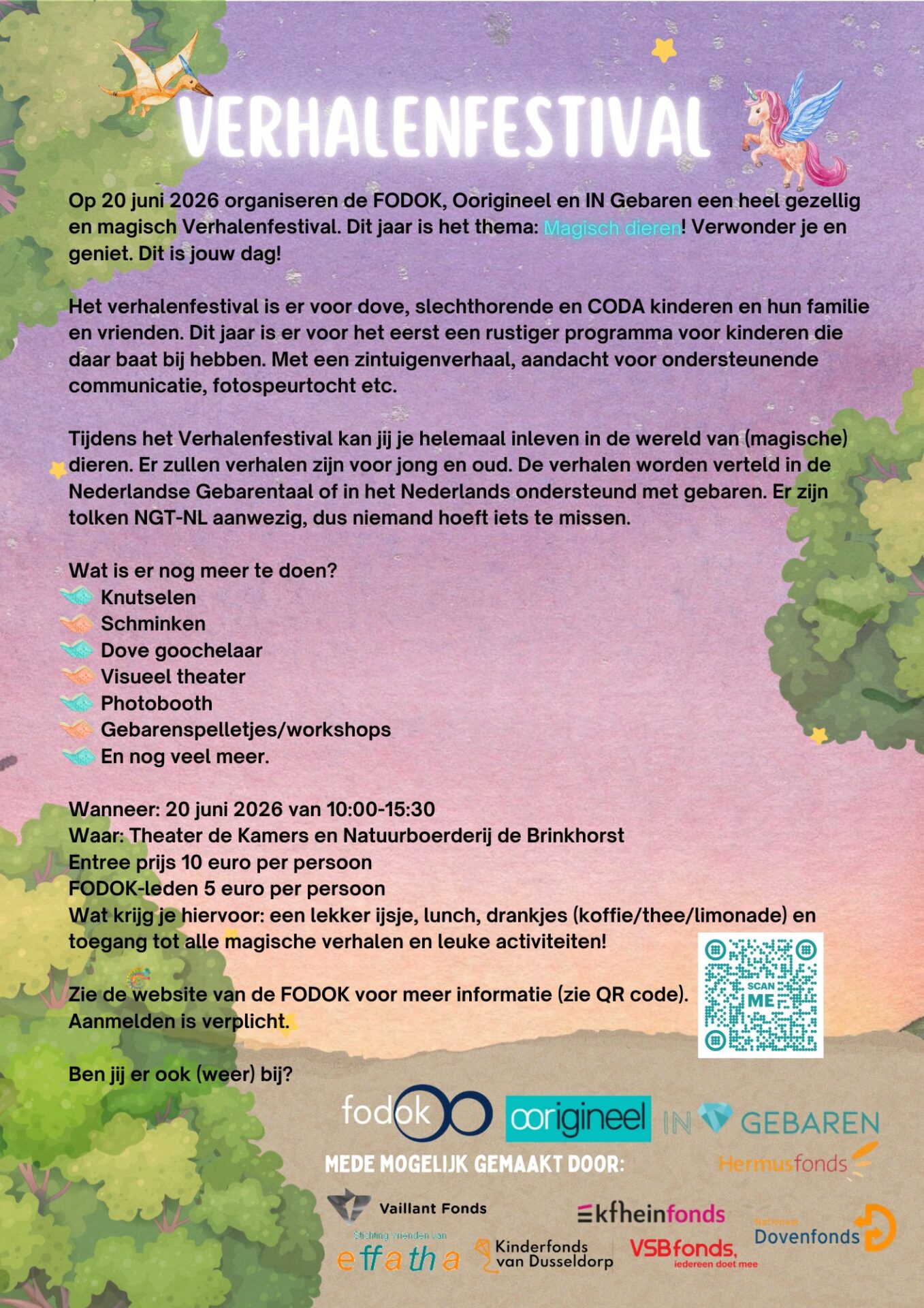Op 20 juni 2026 tussen 10 en 15:30 organiseren de FODOK, Oorigineel en IN Gebaren een heel gezellig en magisch Verhalenfestival. Dit jaar is het thema: Magische dieren! Verwonder je en geniet. Dit is jouw dag!