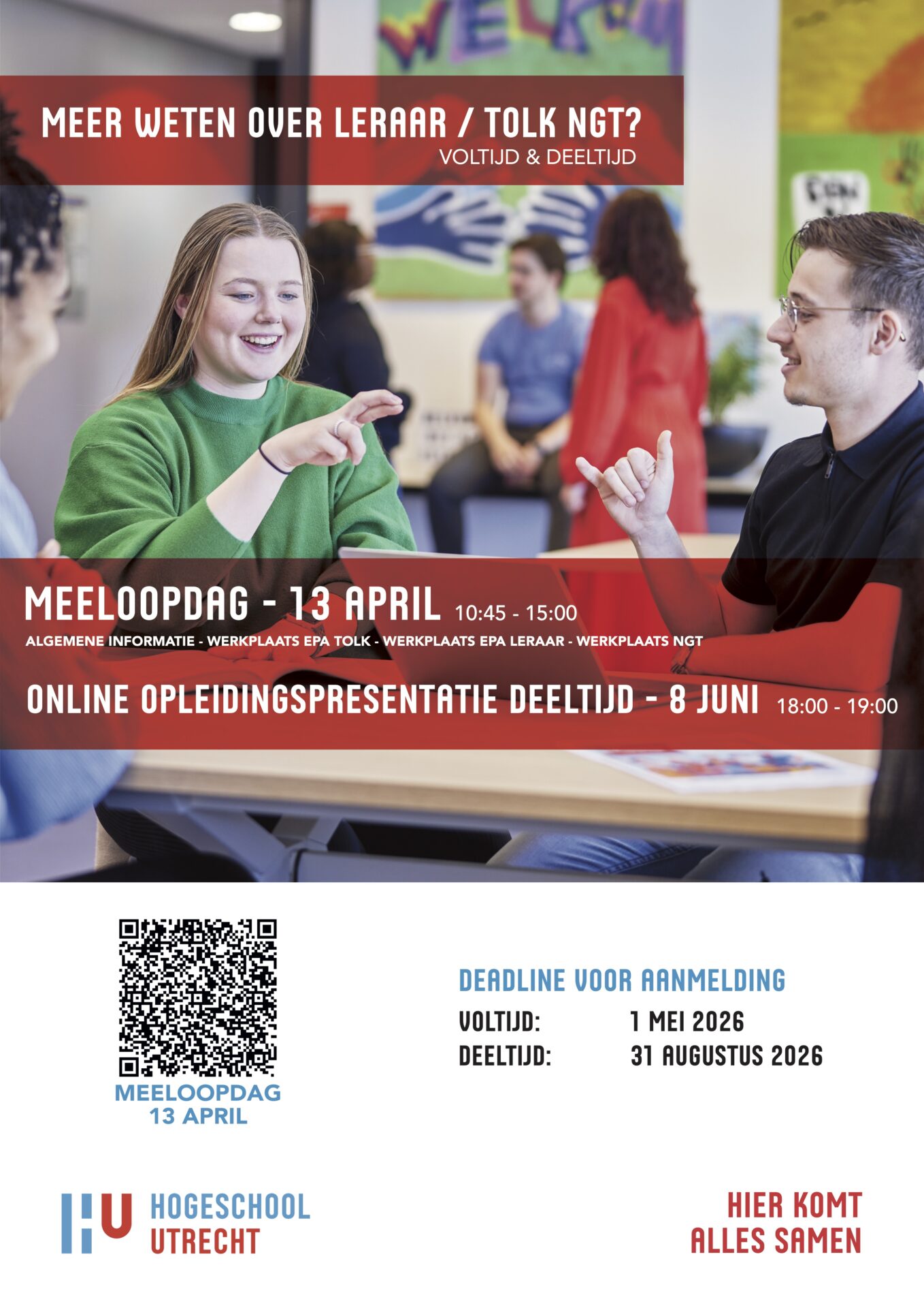 Het Instituut voor Communicatie en Gebarentaal (ICG) aan de Hogeschool Utrecht organiseert op maandag 13 april een meeloopdag, van 11.30-14.30 uur. Scan de QR-code om je aan te melden.